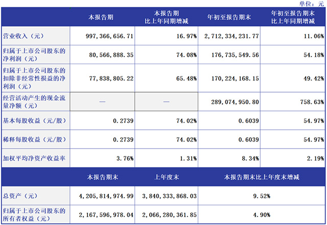 10月29日,中宠股份发布2023年第三季度报告。公司前三季度实现营收27.12亿元,同比增长11.06%;归母净利润1.77亿元,同比增长54.18%;基本每股收益0.6039元,同比增长54.97%。其中,第三季度营收9.97亿元,同比增长16.97%;归母净利润8056.69万元,同比增长74.08%;基本每股收益0.2739元,同比增长74.02%。