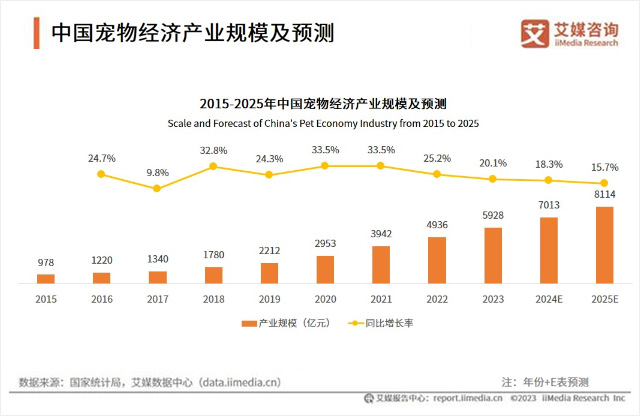 11月16日,全球新经济产业第三方数据挖掘和分析机构艾媒咨询(iiMedia Research)发布《2023-2024年中国宠物行业运行状况及消费市场监测报告》,数据显示,2022年中国宠物经济产业规模达4936亿元;中国养宠家庭户数渗透率也在逐年上升,预计2023年为22%;目前相较于美国和欧洲还存在较大差距,中国宠物市场发展空间巨大。预计2025年中国宠物经济产业规模有望达到8114亿元,其中宠物食品为2670亿元,宠物用品为484亿元。同时,消费升级使得宠物用品和食品朝着多元化方向发展,国产品牌在宠物行业中的地位有望进一步提升。