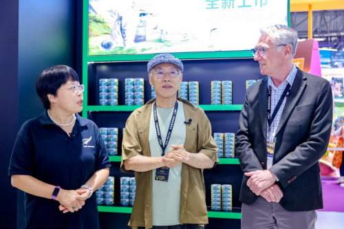 新西兰贸易发展局大中华区总裁Chris Metcalfe先生(中),新西兰贸易发展局上海商务领事Steve Jones先生(中左),中宠股份创始人、董事长郝忠礼先生(中右)莅临ZEAL真致品牌展位