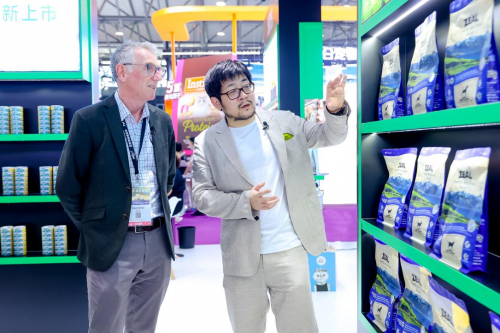 新西兰贸易发展局上海商务领事Steve Jones先生(左)与中宠股份董事、副总裁郝宸龙先生(右)参观ZEAL真致展位