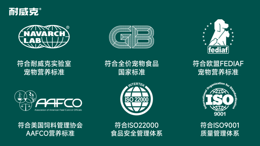 耐威克在质量管控方面获得了多项权威认证。包括国标、欧盟FEDIAF宠物营养标准、美国宠物食品营养标准的“三标认证”。还获得了ISO9001质量管理体系认证、ISO14001环境管理体系认证、ISO22000食品安全管理体系认证、ISO45001职业健康安全管理体系认证“四大质量管理体系认证”。