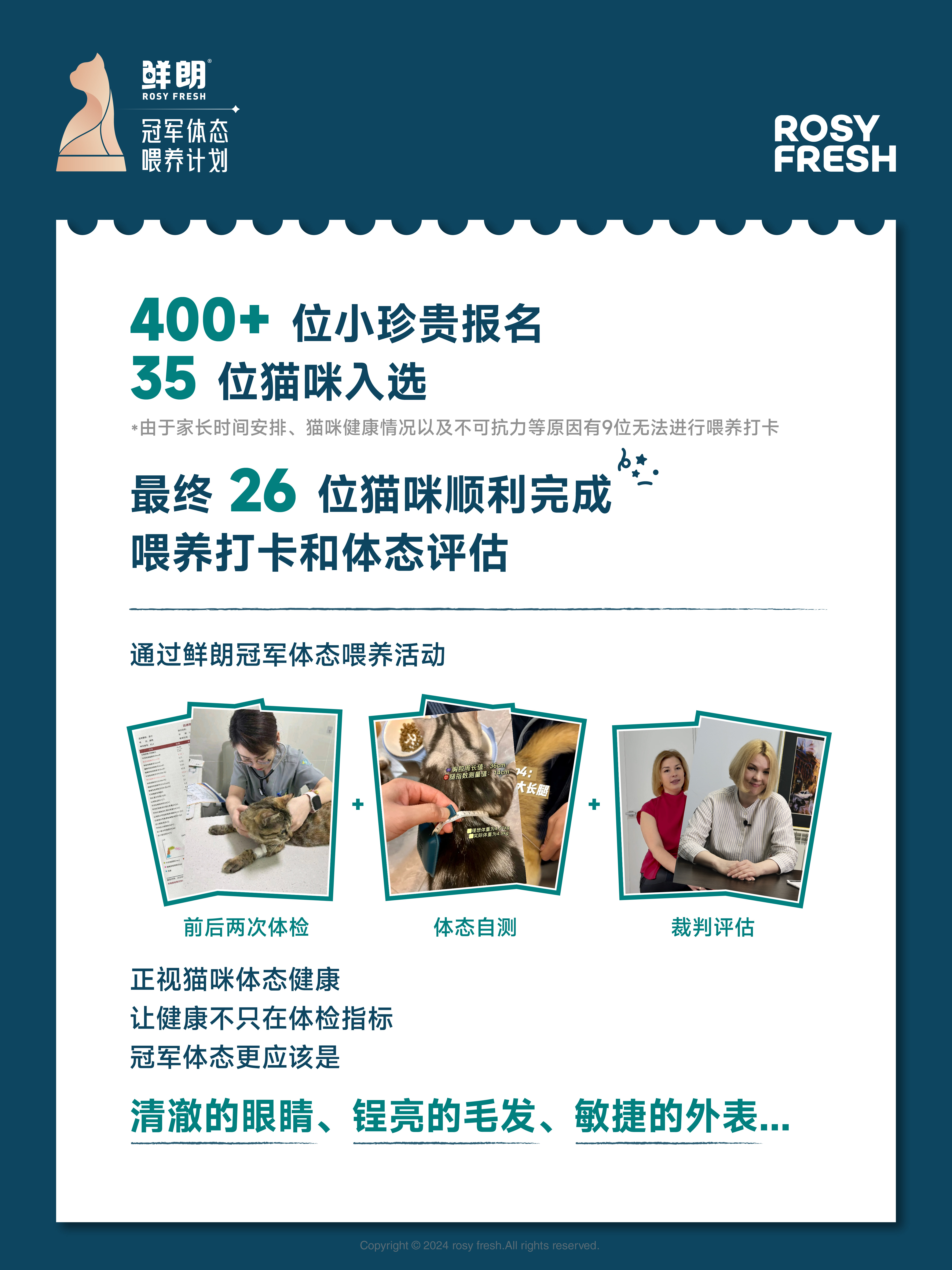该活动从2024年4月初开始启动,通过猫咪的前后两次体检,宠物主的体态自测和日常记录以及专业国际赛级裁判的体态评估,让大家见证了“新鲜宠食”带给宠物真正的健康改变,也让很多养宠家庭也开始正视宠物体态的健康。