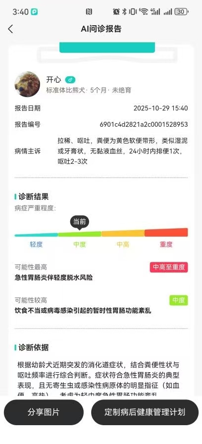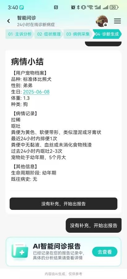 在实际测试中,我们模拟了幼犬腹泻场景,通过在宠拍档APP中进行拍照和多轮问答,系统不仅列出了可能病因,还根据严重程度推荐了家庭处理方案与就医指标,展现出接近人类兽医的判断逻辑和问诊能力。